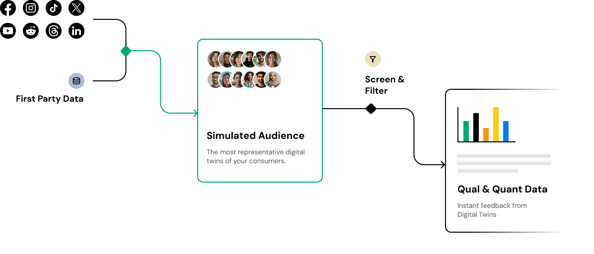 Keplar Digital Twins are built on a continuous pipeline of real time data from the public and social web, enhanced by owned data from our customers. With this combination of data, the behavioral science, large language models, and advanced guardrailing, we're delivering the leading behavioral simulations on the market.